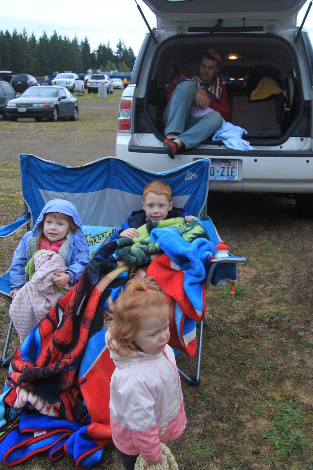 Our back seat can flip backwards so Bob, Leon, and I stayed in there and the kids got to bundle together under a blanket on the lawn chair. It was cold but they were dressed pretty warm. And we brought a bunch of snacks to keep everyone happy.