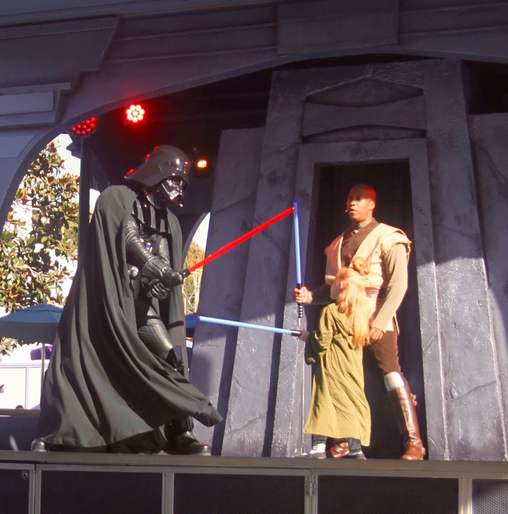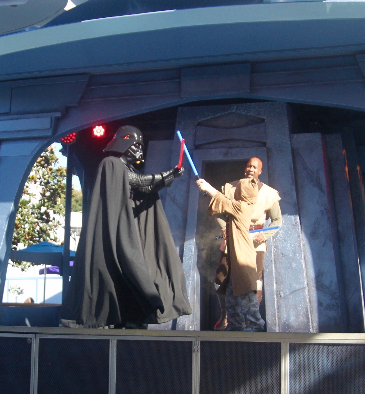 I just think it is so cool that the kids actually got to be a part of it. They really thought they were using the force and training to be Jedi's. Kids get to pretend a lot, but it isn't often that they get to feel like they are really in the show. Afterwards Penelope kept asking me how the stage got lifted. And if it was really by the force. This was definitely one of the kids favorite things they did in Disneyland.