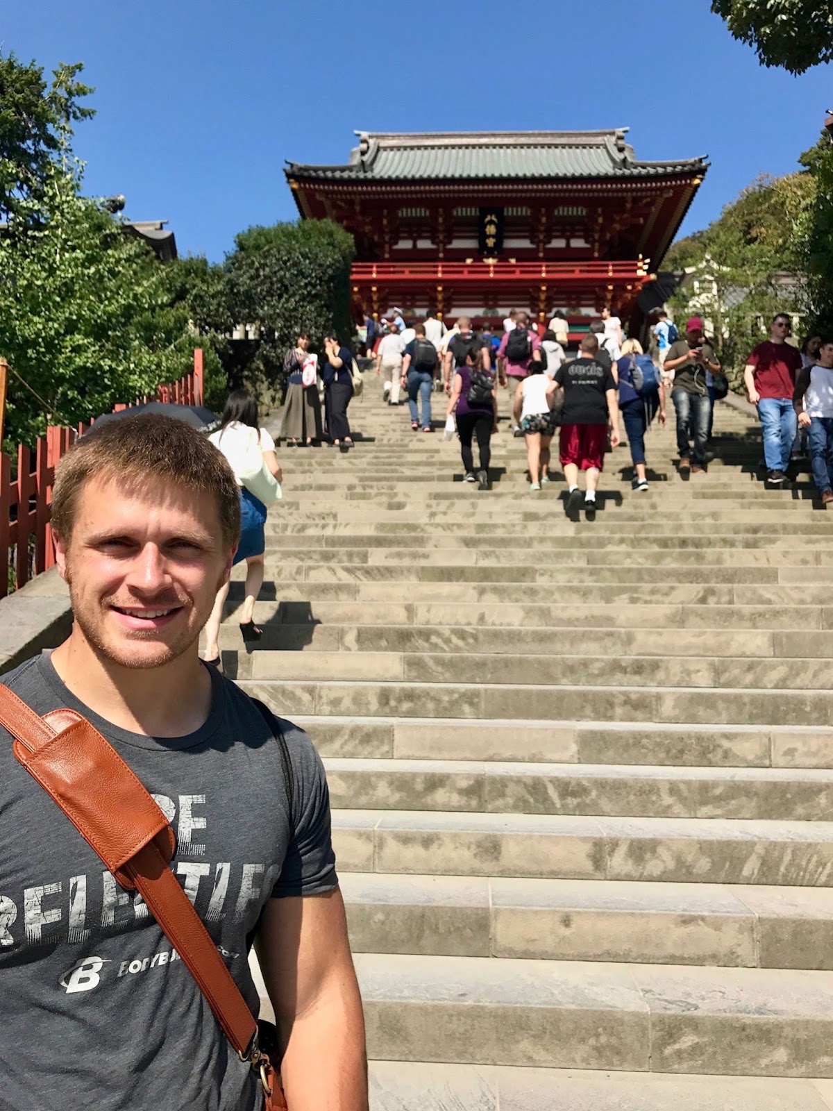 Kamakura is known for its many temples and shrines. We went to one of the really big famous shrines. When I went to take this next picture I was going to wait for the people to move, but then I thought it was just perfect the way it was. People in Japan love their dogs. They are almost always small and cute. So no surprise that this lady is taking a picture of her dog in her dogs stroller in front of the torii gate.