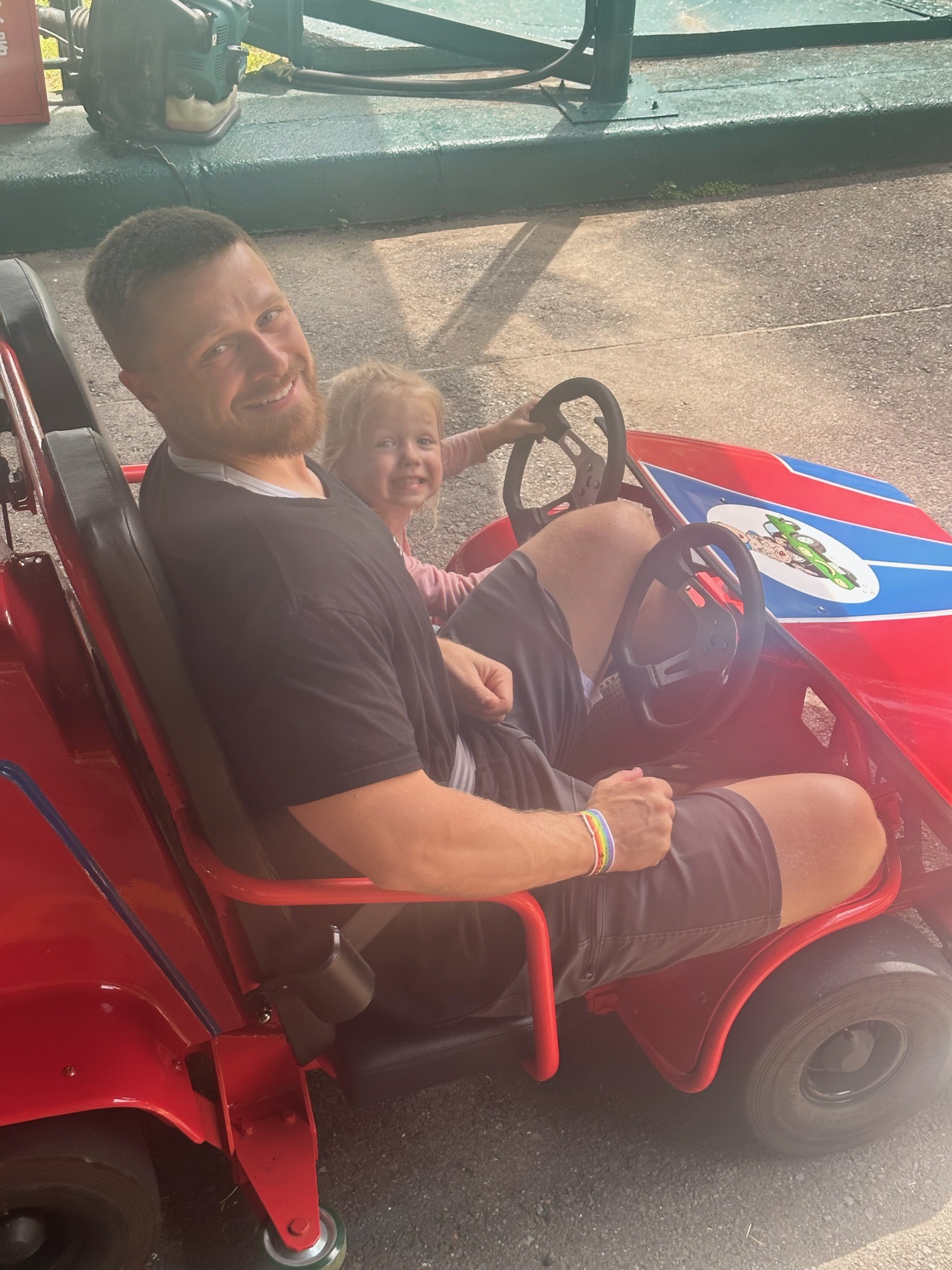 Next time I made sure to go on with Tucker so I didn't have to peddle at all. We did totally slam into the people in front of us (Leon) though who then crashed into the people in front of them (strangers), who then crashed into the car Bob was getting out of. It was right at the end of the ride where everyone was lined up. I didn't realize until the last second that only one seat had a break and I was not sitting in that seat.