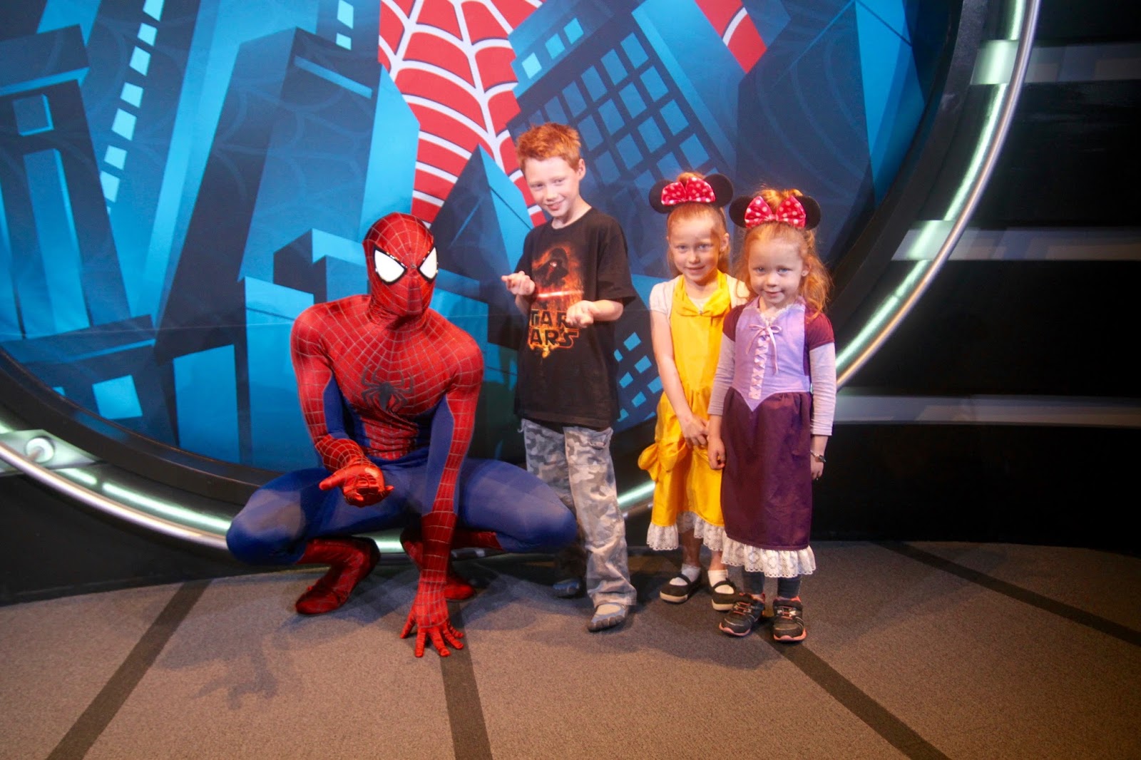 Our first day we spend most of the time in the Star Wars area. I'll post all about star wars tomorrow. We did and saw lot of other fun things too. Like spiderman, Leon was to scared to get up close to some of the characters. I knew the kids would love the Buzz Lightyear ride and we ended up doing it quite a few times. The line always goes quickly and it is near other rides for taller people. So Bob would take the kids on Star tours and Leon and I would go on this ride. Then Bob would come out and do it with Leon and I went on the ride with whomever wanted to do that again. It was a pretty good system. We also did it for Hyperspace Mountain.