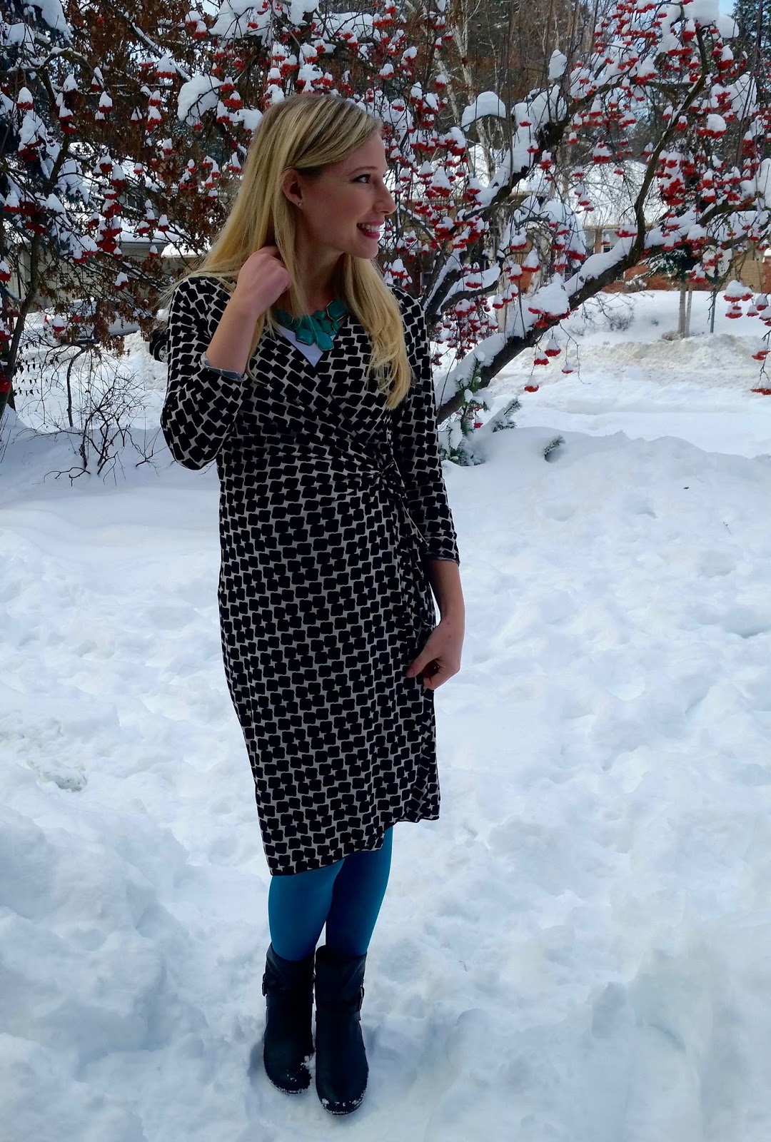 I love this wrap dress! Because it is an actual wrap dress the size is very flexible and I'm still able to wear it at 26 weeks pregnant. My sister's house was freezing, like single digit cold! I was really cold for the 1 minute we spent taking these pictures. And then again for the second 1 minute photo session because I didn't like the first pictures.